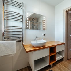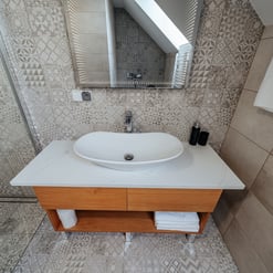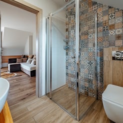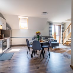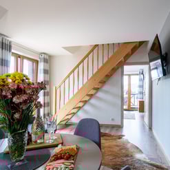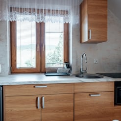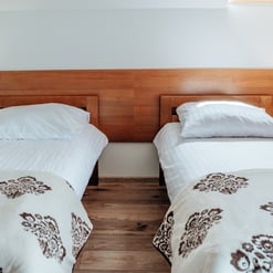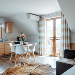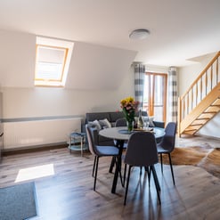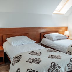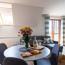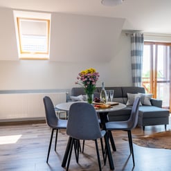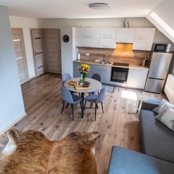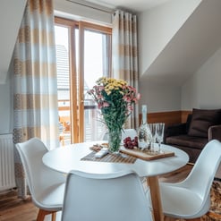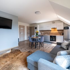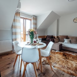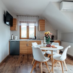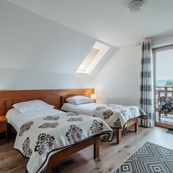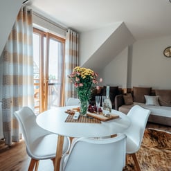Nasz Apartament Deluxe o powierzchni 60 m² to przestronne i komfortowe wnętrze, idealne dla rodzin, grup przyjaciół lub par, które pragną spędzić niezapomniany czas w malowniczej okolicy. Apartament wyposażony jest w 4 pojedyncze łóżka oraz rozkładaną dwuosobową sofę, co zapewnia wygodę i przestronność dla sześciu osób. Z jego okien oraz balkonu roztacza się zapierający dech w piersiach widok na Jezioro Czorsztyńskie oraz otaczające góry, co sprawia, że pobyt staje się prawdziwą przyjemnością. Na balkonie znajdują się stolik i krzesła, idealne do relaksu na świeżym powietrzu.